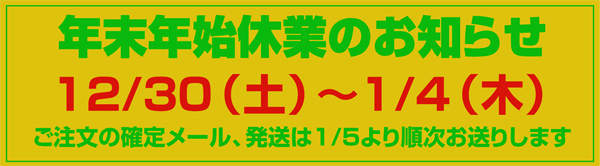 なおウェブ・ショップからのご注文は常に受け付けておりますが、ご注文の確認メールの送信やご質問に対するご返信、入荷のご連絡、出荷作業につきましては、1月5日(木)以降の対応となりますので予めご了承ください。